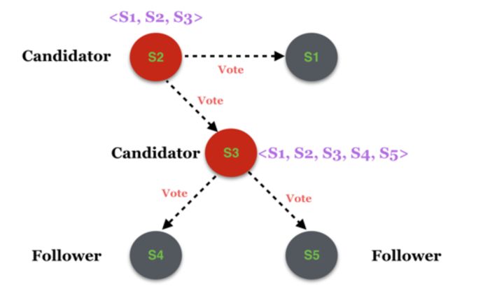 这时在S2的眼里,拓扑依然是<S1, S2, S3>,而在S3的眼里拓扑则变成了<S1, S2, S3, S4, S5>.假如此时由于某种原因触发了一次新的选主,S2和S3分别发起选主的请求: