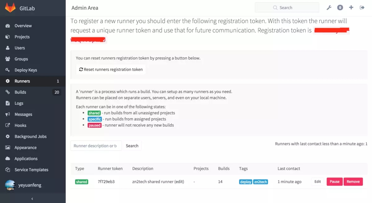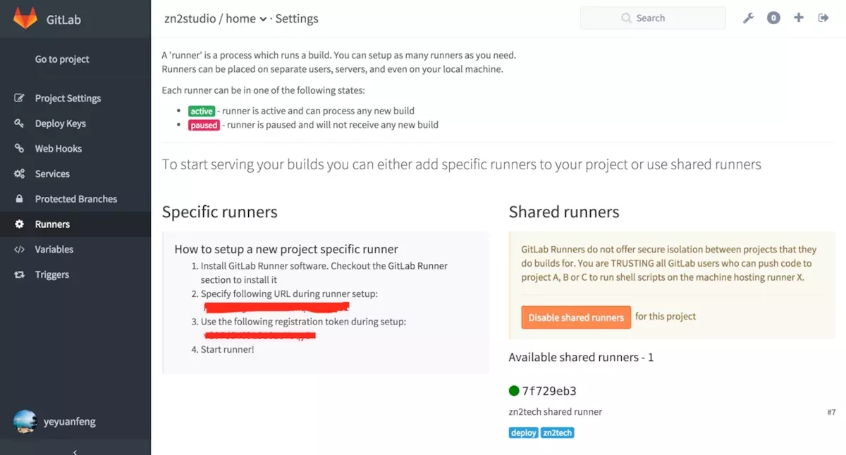 如果要注册Specific Runner,您需要到项目的设置的Runner页面里面去找注册token.如下图所示: